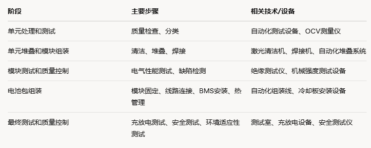 單元根據(jù)特性進行分類(binning),例如按容量和內(nèi)阻分組,以確保最終電池包的一致性。